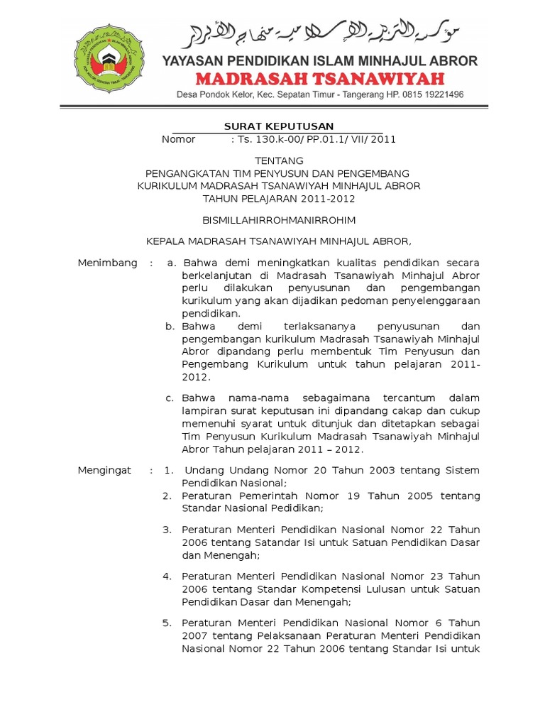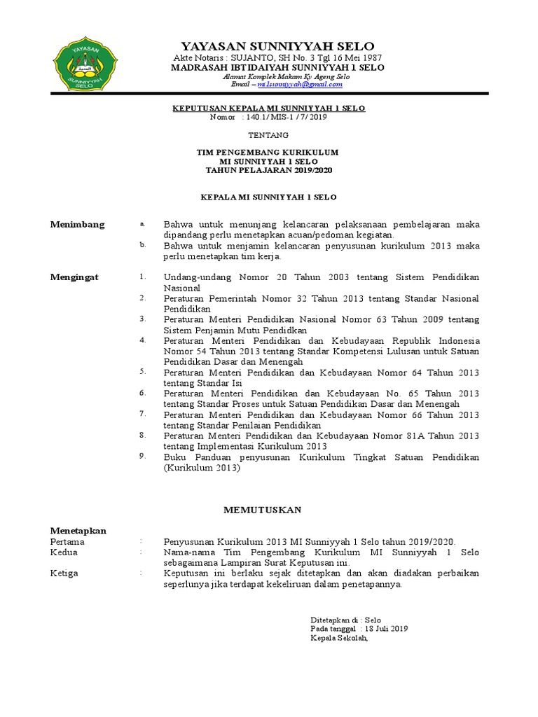 Contoh Sk Tim Pengembang Kurikulum Terbaru Tahun Pelajaran 2019 2020 Info Baru